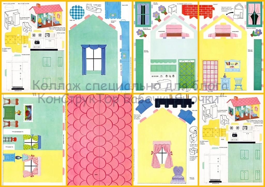 На каждом листочке есть рисованная инструкция, наглядно объясняющая как поступать с данной деталью. Собирайте домик по этому описанию. Для прочности наклеивайте все детали на картон.